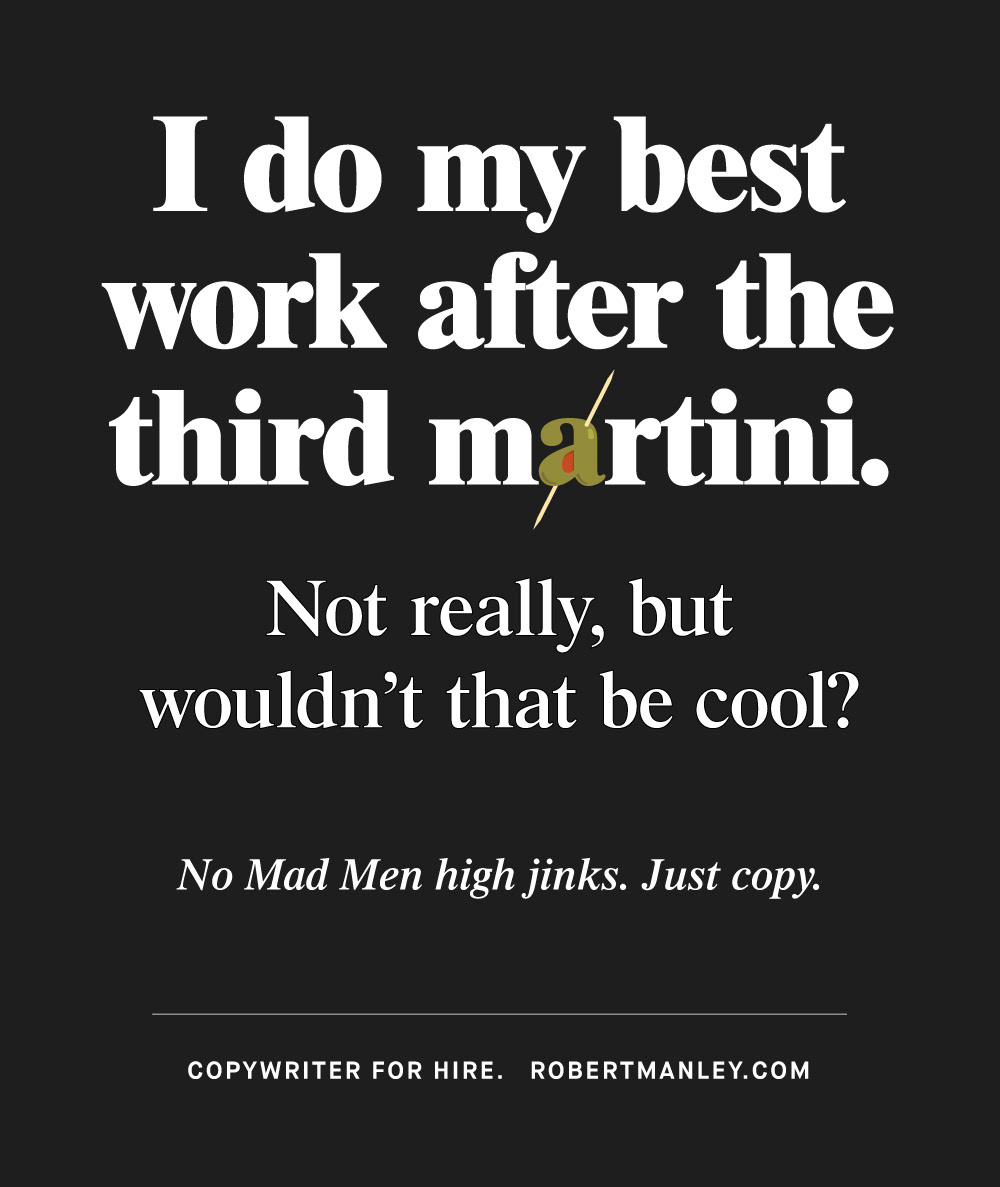 Copywriters are human beings. Humans require food. Food costs money; at least for non-agrarian humans it does. Ergo, copywriters need work. In essence, I became my own client. It’s a work in progress, but so far no one has been injured in the process. Designer: Jontue Hollingsworth hollingsworthdesign.co