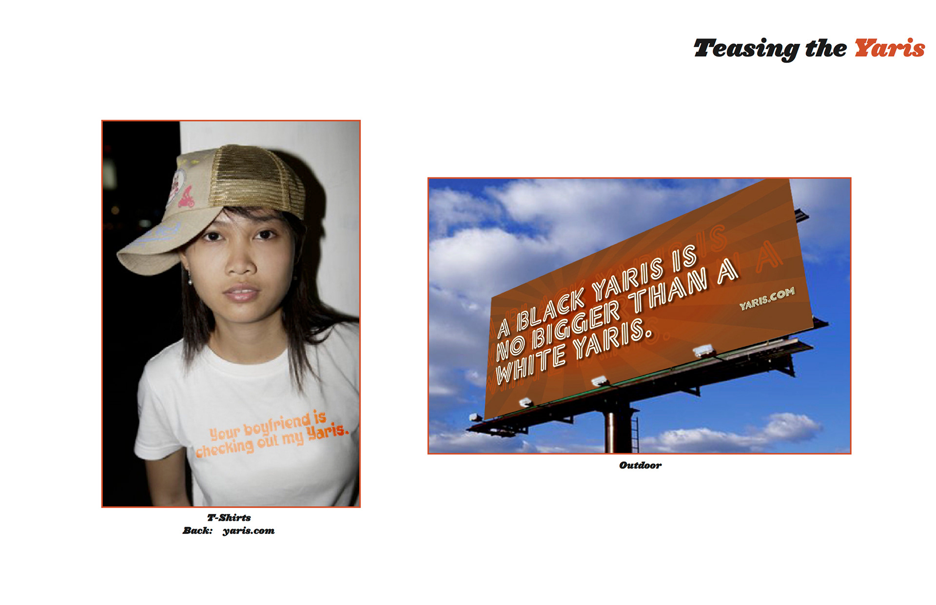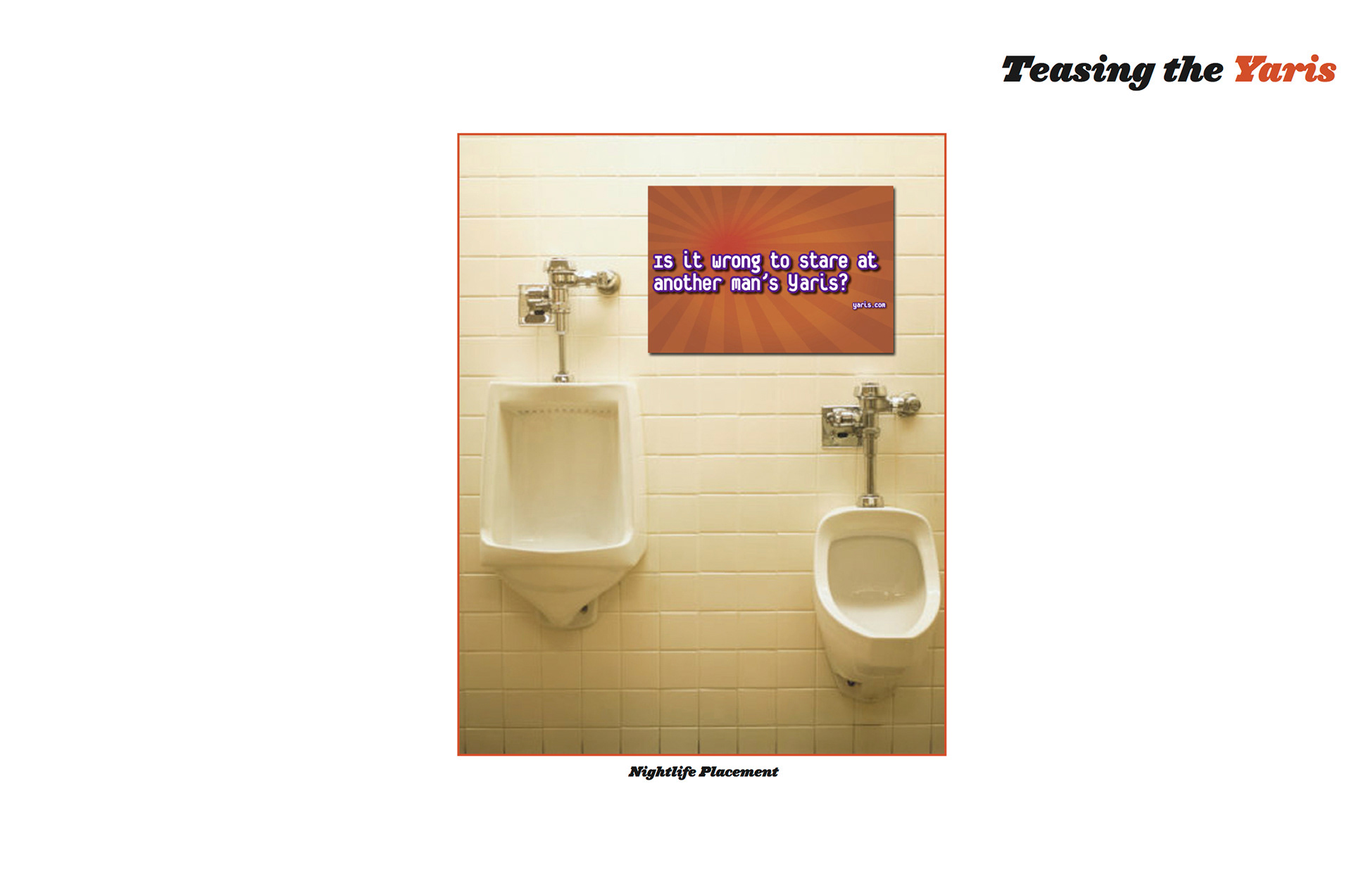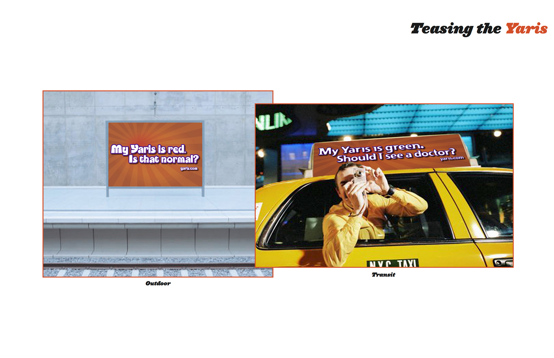 Toyota was launching a new vehicle with a funny name. We created a teaser campaign that took the high road; a seventh grade-level high road. It came this....close to running. Art Director: Max Elo maxelo.com